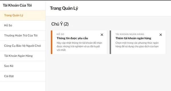 Tiếp theo, bạn hãy vào mục “Tài Khoản Của Tôi” để bổ sung các thông tin còn thiếu như: họ và tên, ngày tháng năm sinh, số điện thoại, quốc tịch. Quan trọng nhất là bạn cần dùng họ tên thật, trùng với tên chủ tài khoản ngân hàng mà bạn sẽ dùng để nạp hoặc rút tiền về sau. Nếu thông tin không trùng khớp, các giao dịch tài chính có thể bị hệ thống từ chối để bảo vệ quyền lợi người dùng.